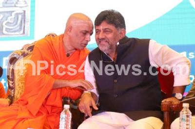 Photo Caption : DCM DK Shivakumar with Sri Nirmalananda Swamiji during the "Udyami Vokkaliga" first circle expo and 2nd annual convention at Palace Grounds, in Bengaluru on Friday 19th January 2024