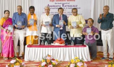 Photo Caption : Dr. CN Manjunath, Director, Sri Jayadeva Institute of Cardiovascular Sciences and Research with Music Director Hamsalekha, Dr. AV Prasanna, President, Babboorukamme Seva Samithi, PG Dwarakanath, National Awardee Headmaster, Secretary, VVS, VY Venkatesh, Padmashree Awardee , S Harish, Former Deputy Mayor, BBMP, Alumni of VVHS and Dr. N Sathyaprakash, National Awardee Teacher, (Rtd) during the release of "Anarghya Ratnagalu" book at Samskruthi, in Bengaluru on Sunday 21st January 2024