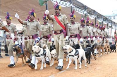 Photo Caption : Police sniffer dog march past during the full dress rehearsal for the Republic Day celebrations at Manekshaw Parade Grounds, in Bengaluru on Wednesday 24th January 2024