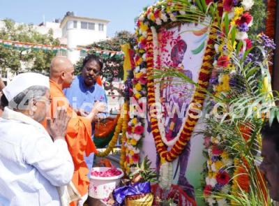 Photo Caption : CM Siddaramaiah with Sri Nirmalananda Swamiji, Former Minister HM Revanna and others during the Sangolli Rayanna death anniversary program , in Bengaluru on Friday 26th January 2024