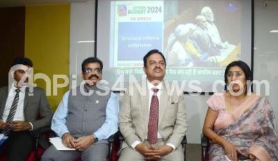 Photo Caption : Ramesh Chandra Lahoti, President, FKCCI with Vice President Uma Reddy, Sr Vice President MG Balakrishna and Chairman Central Taxes Committee, FKCCI Shravan Gudutur during the live budget by central finance minister Nirmla Sitharam meeting at FKCCI, in Bangalore on Thursday 1st February 2024