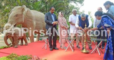 Photo Caption : Madegowda, President Soliga Abhivruddhi Association with Rajeev Gowda Former MP, Sudhasa Malkhede PCCF ,Shamala Iqbal IAS during Inauguration of the Elephants Lantana Camara Exhibition at Lalbagh, in Bangalore on Saturday 3rd February 2024