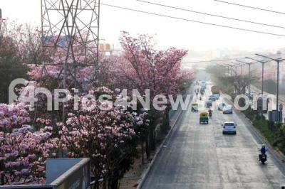 Photo Caption : Pink tabebuia rose flower blooming for the season at Nagarbhavi ring road, in Bengaluru on Sunday 11th February 2024