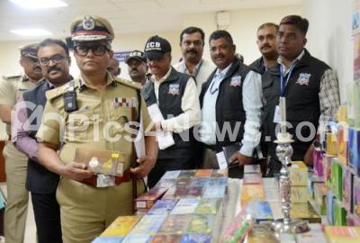 Police commissioner B Dayanand along with officials during the property parade of Tobacco seized by CCB at Commissioners office, in Bengaluru on Tuesday 13th February 2024