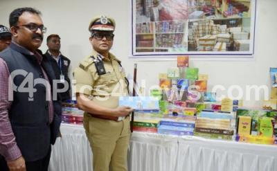 Photo Caption : Police commissioner B Dayanand along with officials during the property parade of Tobacco seized by CCB at Commissioners office, in Bengaluru on Tuesday 13th February 2024