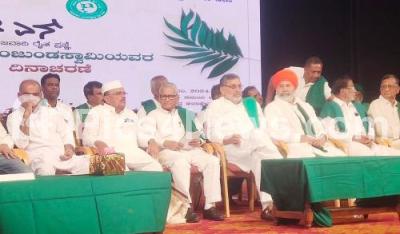 Photo Caption : Farmer leader Rakesh Tikait with State Farmer leaders during 88th birth anniversary program of Farmer Leader MD Nanjunda Swamy at Ravindra Kalakshetra, in Bengaluru on Tuesday 13th February 2024