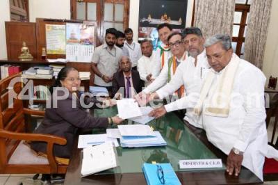 Photo Caption : Congress Rajya Sabha Election candidate Ajay Maken submitting his nomination paper to election returning officer, also seen are Chief Minister of Karnataka Siddaramaiah, DCM DK Shivakumar, Congress leader Randeep Surjeewala, at Vidhana Soudha, in Bengaluru on Thursday 15th February 2024