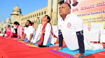 Photo Caption : Minister of Health and Family Welfare of Karnataka Dinesh Gundu rao and others perform yoga and Surya Namaskara in front of Vidhana Soudha as part of Ratha Saptami, organised by Ayush Dept. GoK , in Bengaluru on Sunday 18th February 2024
