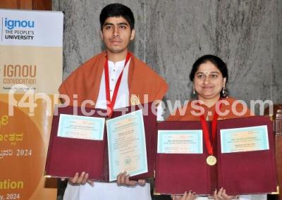 Photo Caption : Students with their gold medals and certificates during 37th convocation of Indira Gandhi National Open University at Town Hall, in Bengaluru on Tuesday 20th February 2024