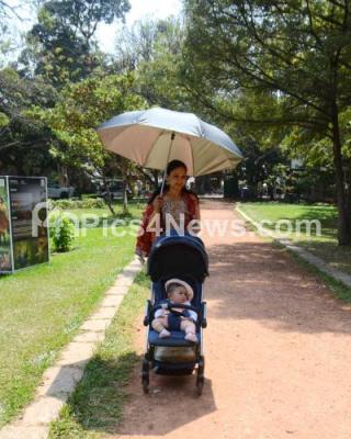 Photo Caption : A mother using an umbrella to cover herself and her baby from the scorching heat at Lalbagh, in Bengaluru on Thursday 22nd February 2024