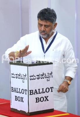 Photo Caption : DCM DK Shivakumar casting his vote for the Rajya Sabha elections at Vidhana Soudha, in Bengaluru on Tuesday 27th February 2024