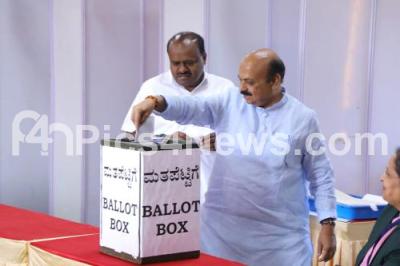 Photo Caption : Former CM and MLA Basavaraj Bommai casting his vote for the Rajya Sabha elections at Vidhana Soudha, in Bengaluru on Tuesday 27th February 2024