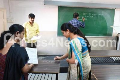Photo Caption : Teachers and staff writing exam registration numbers in classrooms at Seshadripuram College in preparation for 2nd PUC exams, in Bengaluru on Thursday 29th February 2024