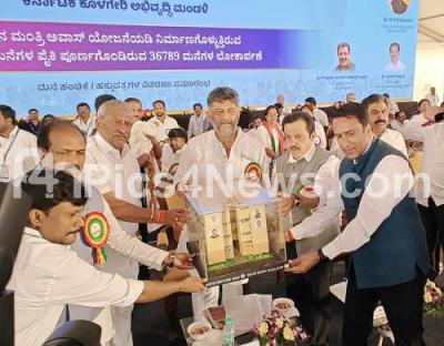 Photo Caption : DCM DK Shivakumar, Minister Zameer Ahmed Khan, MLA Byrathi Basavaraj, State Planning Commission Vice Chairman Prof. Rajeev Gowda, Chairman Karnataka Slum Development Board and others during the Karnataka Slum Development Board constructed flats distribution program KR Puram , in Bengaluru on Saturday 2nd March 2024