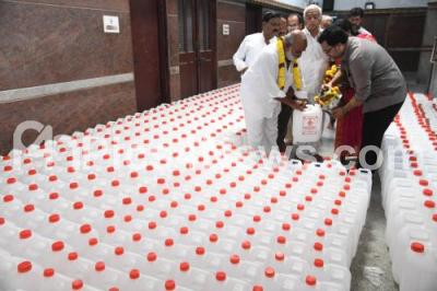 Photo Caption : Former Minister Krishnaiah Shetty and distributing 40,000 liters Gangajal to all temples on the eve of Maha Shivaratri Festival at Sri Kashi Visveshwaraswamy Temple, in front of Chickpet Police Station, in Bengaluru on Wednesday 6th March 2024