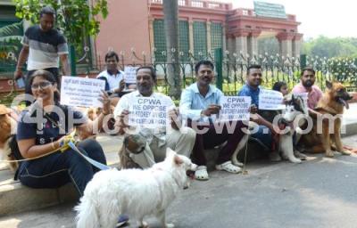 Photo Caption : Members of Cubbon Park Walkers Association (CPWA) held a unique protest with pet dogs against the construction of a 10-storey building as an annexe to the High Court, within the Cubbon Park premises, in Bengaluru on Sunday 10th March 2024