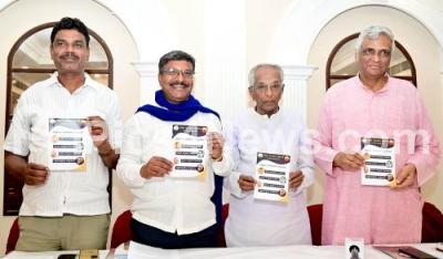 Photo Caption : Members of Samaana Manaskara Vedike (Equal Mindful platform) Go Ru Channabasappa, Baapu Yeddur Shetty, Mavalli Shankar, GV Sundar during a press conference on Vachana Samvidhana Manifesto for the forthcoming Lok Sabha Election 2024, in Bengaluru on Wednesday 13th March 2024
