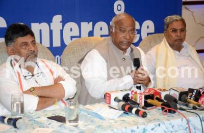 Photo Caption : AICC President Mallikarjuna Kharge with Chief Minister of Karnataka Siddaramaiah and KPCC President and DCM DK Shivakumar during a press conference at a private hotel, in Bengaluru on Saturday 16th March 2024