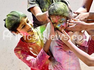 Photo Caption : Children celebrate the Holi festival with colors, in Bengaluru on Sunday 24th March 2024