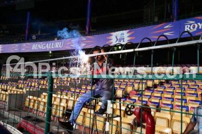 Event Description : Workers welding steel grills at Chinnaswamy stadium in the precautionary measurements for not entering public to the grounds to meet their favourite cricketers, in Bengaluru on Thursday 28th March 2024