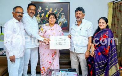 Photo Caption : KPCC President, DCM DK Shivakumar distributed Form B to Bangalore South Lok Sabha constituency Congress candidate Sowmya Reddy at his residence, in Bengaluru on Friday 29th March 2024