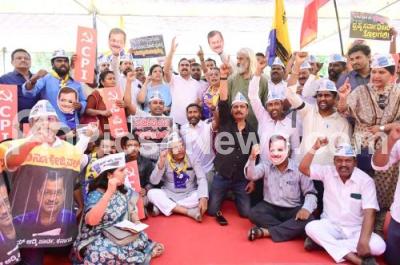 Photo Caption : Aam Aadmi Party leaders and workers led by State President Mukhyamantri Chandru with CPI leaders and workers stage a protest against the arrest of Delhi CM and AAP Supremo Arvind Kejriwal by ED, in connection with the excise policy case, in Bengaluru on Sunday 31st March 2024