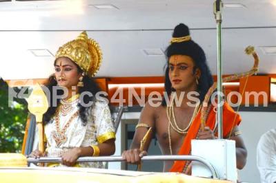 Photo Caption : People dressed as Sri Rama and Goddess during the Bengaluru Central BJP Lok Sabha Candidate PC Mohan nomination file procession, in Bengaluru on Monday 1st April 2024