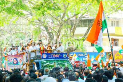 Bengaluru South Congress Lok Sabha Candidate Sowmya Reddy with Congress leaders DK Shivakumar, Krishnappa, Priya Krishna, Ramalinga Reddy, Umapathy, RV Devraj and others arriving in the rally to submit Bengaluru South Congress Lok Sabha Candidate Sowmya Reddy nomination papers, in Bengaluru on Monday 1st April 2024