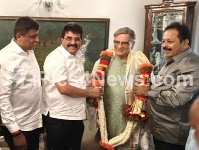Photo Caption : Mandya Lok Sabha Congress candidate Venkataramane Gowda (Star Chandru) met Former Union Minister SM Krishna and seeking his support for the election for the Mandya Lok Sabha election at his residence, in Bengaluru on Tuesday 2nd April 2024