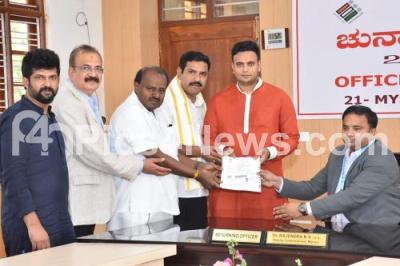 Photo Caption : Mysore Kodagu Lok Sabha BJP MP Candidate Yaduveer Krishnadatta Chamaraja Wadiyar submitting his nomination paper to Election returning officer, also seen are JD(S) State President HD Kumarswamy, BJP state President BY Vijayendra and others, in Mysuru on Wednesday 3rd April 2024
