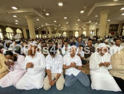Photo Caption : Muslim community people take part in Jumat-Ul-Wida, the last Friday of the month of Ramadan, at Sultan Shah Mosque, Central Congress candidate Mansoor Ali Khan was present in the prayers, in Bengaluru on Friday 5th April 2024