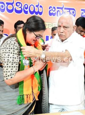 Event Description : Sumalatha Ambareesh joined BJP party in the presence of BJP State President BY Vijayendra at BJP office, also seen are BJP leaders BS Yediyurappa, R Ashoka, Radha Mohandas Agarwal and others, in Bengaluru on Friday 5th April 2024