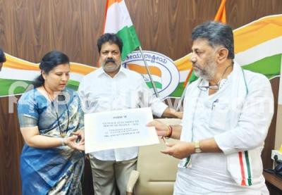 Photo Caption : KPCC President, DCM DK Shivakumar distributed Form B to Uttara Kannada Lok Sabha constituency Congress candidate Anjali Nimbalkar, in Bengaluru on Saturday 6th April 2024