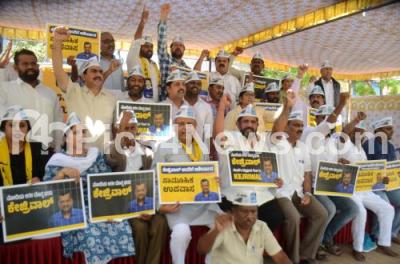Aam Aadmi Party leaders and workers led by State President Mukhyamantri Chandru staged a protest against the arrest of Delhi CM and AAP Supremo Arvind Kejriwal by ED, in connection with the excise policy case at Freedom Park, in Bengaluru on Sunday 7th April 2024