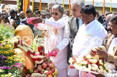 Photo Caption : Chief Minister of Karnataka Siddaramaiah with Council Chairman Basavaraj Horatti, Minister HC Mahadevappa offering floral tribute to the statue of Dr BR Ambedkar at Vidhana Soudha, on the occasion of Ambedkar Jayanti, in Bengaluru on Sunday 14th April 2024