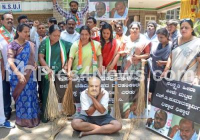 Photo Caption : Members of Bengaluru Youth congress and Women wing protesting against Former Chief minister and JD(S) State President H D Kumaraswamy alleging his statement against women, in Bengaluru on Monday 15th April 2024