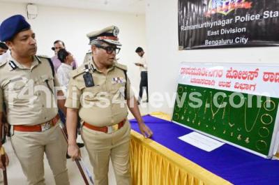 Photo Caption : Police Commissioner Dayananda inspects the seized jewels during a press conference on property parade at Police commissioner office, in Bengaluru on Tuesday 16th April 2024