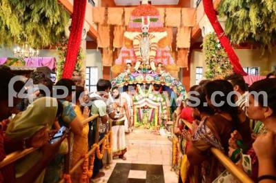 Photo Caption : Devotees offered prayer at Sri Rama temple on the occasion of Sri Rama Navami festival, at Vasant Nagar, in Bengaluru on Wednesday 17th April 2024