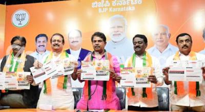 Photo Caption : BJP MLAs R Ashok, Ravi Subramanya, Uday Garudachar, Raghu during a press conference at BJP Media Centre, in Bengaluru on Friday 19th April 2024