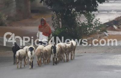 Photo Caption : A farmer moving with his sheeps during the light rain at Ramasandra , in Bengaluru on Friday 19th April 2024