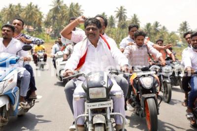 Photo Caption : Bengaluru Rural Lok Sabha Congress candidate DK Suresh held a bike rally during his Lok Sabha election campaign, in Kanakapura on Monday 22nd April 2024