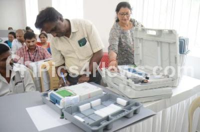Photo Caption : On election duty polling officials check Electronic Voting Machine (EVM) before taking to the designated polling booths, on the eve of Lok Sabha elections, at Kamala Bai School, Queens Road, in Bengaluru on Thursday 25th April 2024