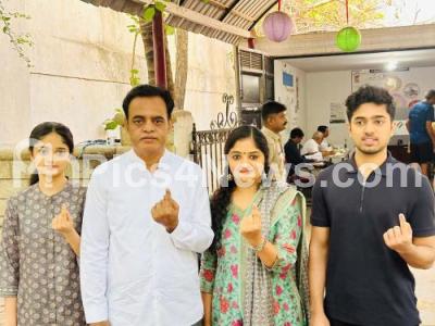 Photo Caption : BJP MLA and Former DCM Ashwatnarayan and his family members showing their marked fingers after casting their vote for the Lok Sabha election, in Bengaluru on 26th April 2024