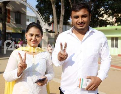 Photo Caption : Actress Amulya and her husband Jagadish cast their vote for the Lok Sabha elections, at RR Nagar, in Bengaluru on Friday 26th April 2024