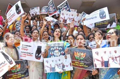 Photo Caption : Members of State Congress Women wing led by All India National Women Congress President Alka Lamba protesting against JDS and BJP alliance Lok Sabha candidate Prajwal Revanna embroiled in a sex scandal, at KPCC office, in Bengaluru on Monday 29th April 2024