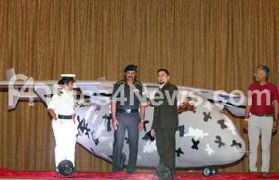 Colonel B. Ravi, Secretary Regional Technode with Suhas Tejaskanda, Founder and CEO of Flying Wedge Defence and DBV Narasimham, COO, Flying Wedge at the unveiling the India First Military Grade Bomber UAV, FWD 200B during a press conference, in Bengaluru on Friday 3rd May 2024