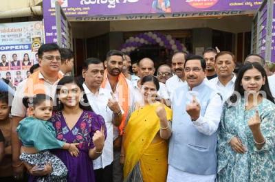 Photo Caption : Union Minister Pralhad Joshi and his family members showing inked finger after casting their vote for the Lok Sabha election, in Dharwad on Tuesday 7th April 2024