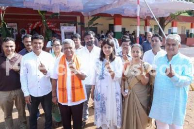 Photo Caption : Former Chief Minister and Belagavi BJP Lok Sabha Candidate Jagadish Shetter, MP Mangala Suresh Angadi and others showing inked finger after casting their vote for the Lok Sabha election, in Belagavi on Tuesday 7th April 2024