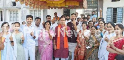 Photo Caption : Union Minister Bhagawanth Khubha and his family members showing their inked fingers after casting their vote for the Lok Sabha election, in Bidar on Tuesday 7th April 2024