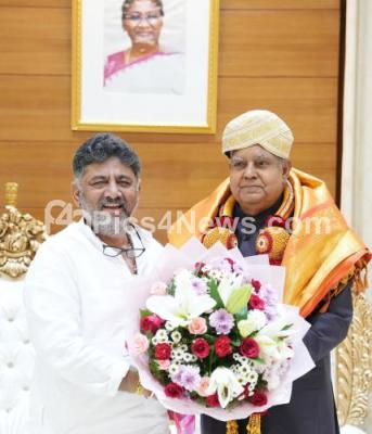 Photo Caption : DCM DK Shivakumar met and felicitated Vice President Jagdeep Dhankhar at Raj Bhavan, in Bengaluru on Monday 27th May 2024